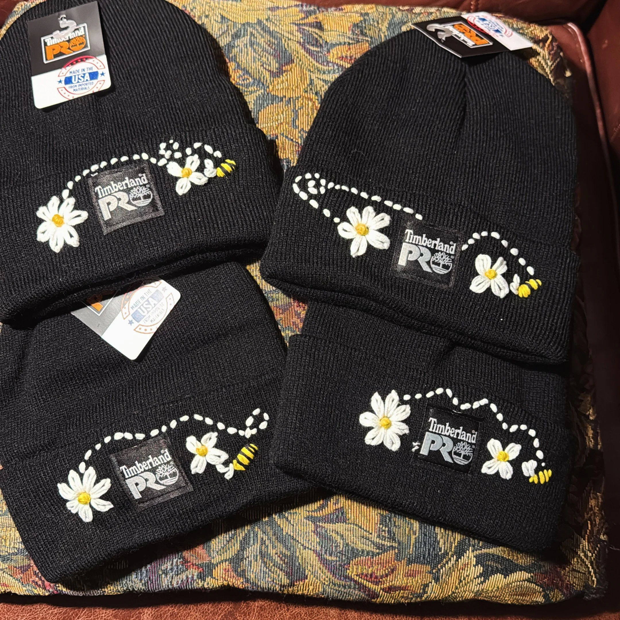 Amy Baluch, hand embroiders baseball and winter (beanie) hats with decorative stitching and stylish pizzaz!