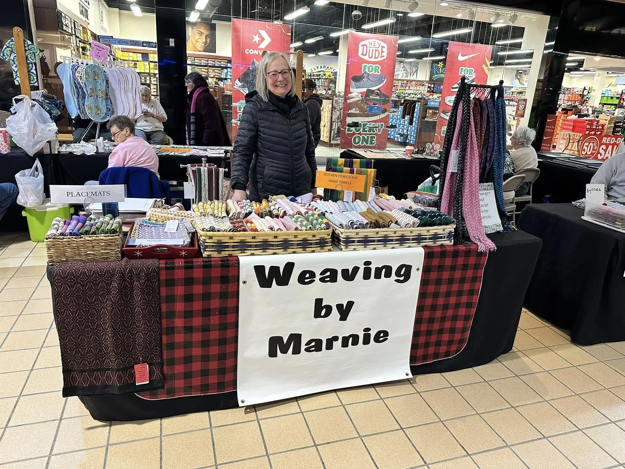 Marnie is a handweaver based in Oneonta, NY. She creates kitchen towels, hand towels, table runners, placemats, and dishcloths using 100% cotton or cotton-linen blends. She also weaves lightweight art scarves from nylon, as well as winter scarves made from silk-wool blends, wool, or alpaca.